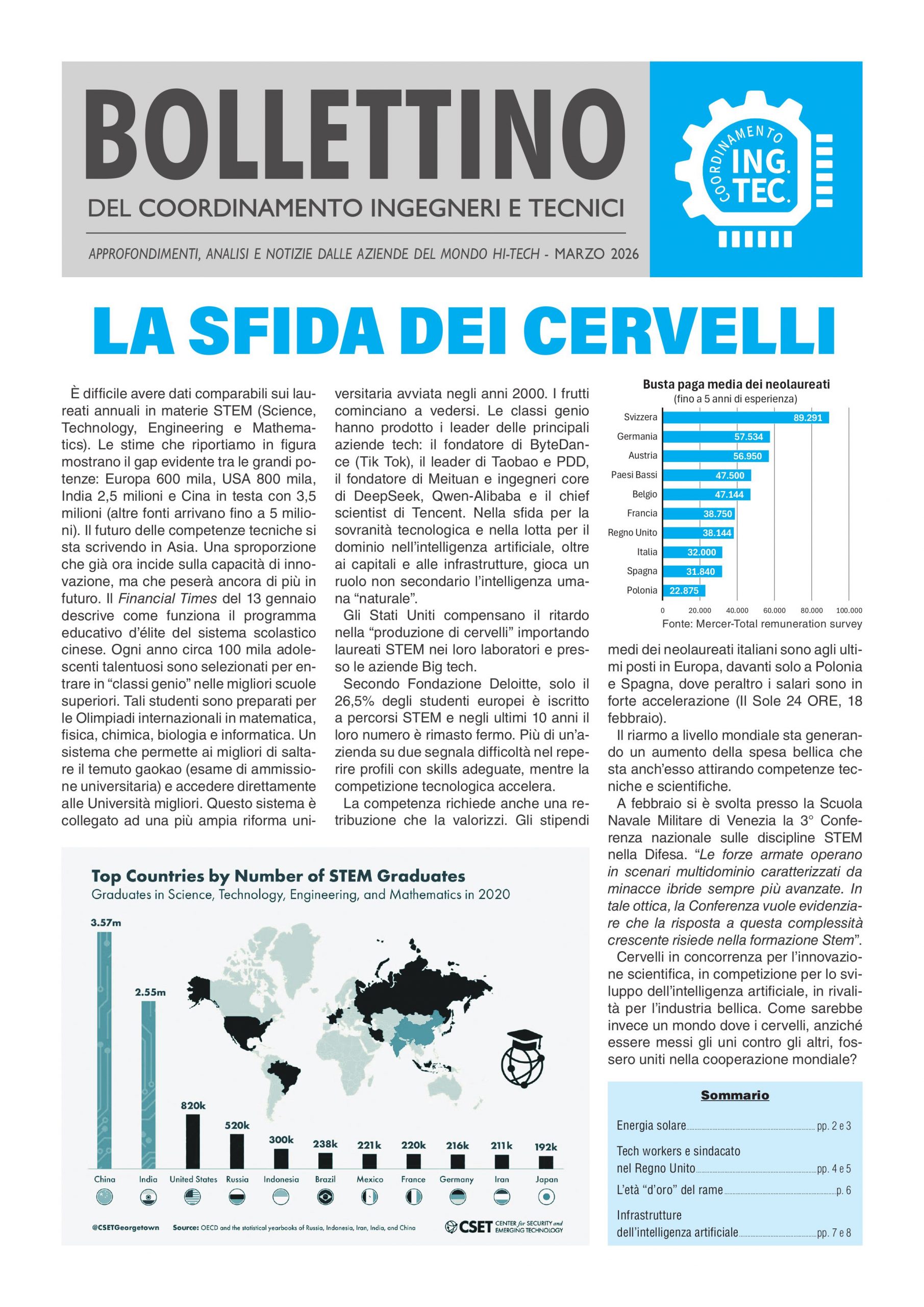 È difficile avere dati comparabili sui laureati annuali in materie STEM (Science, Technology, Engineering e Mathematics). Le stime che riportiamo in figura mostrano il gap evidente tra le grandi potenze: Europa 600 mila, USA 800 mila, India 2,5 milioni e Cina in testa con 3,5 milioni (altre fonti arrivano fino a 5 milioni).